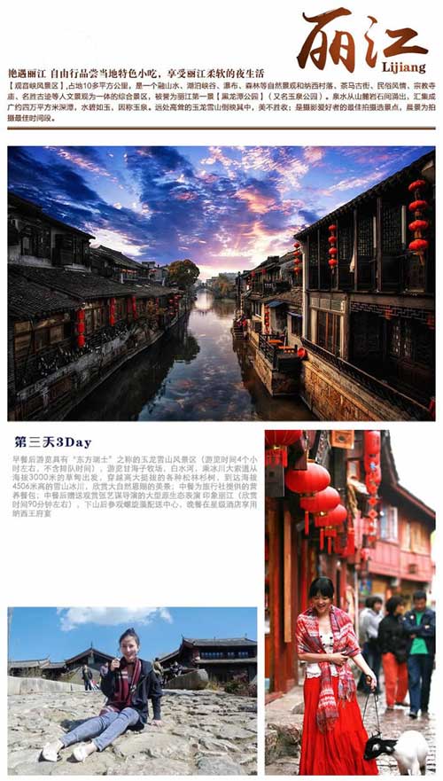 大理有“风花雪月”的美称,即下关风、上关花、苍山雪、洱海月。大理点苍山,早在金庸的武侠小说里为世人所熟知,段氏的大理古城,更给大理这个现代化的旅游城市带来了浓厚的历史色彩。丽江属高原型西南季风气候,丽......