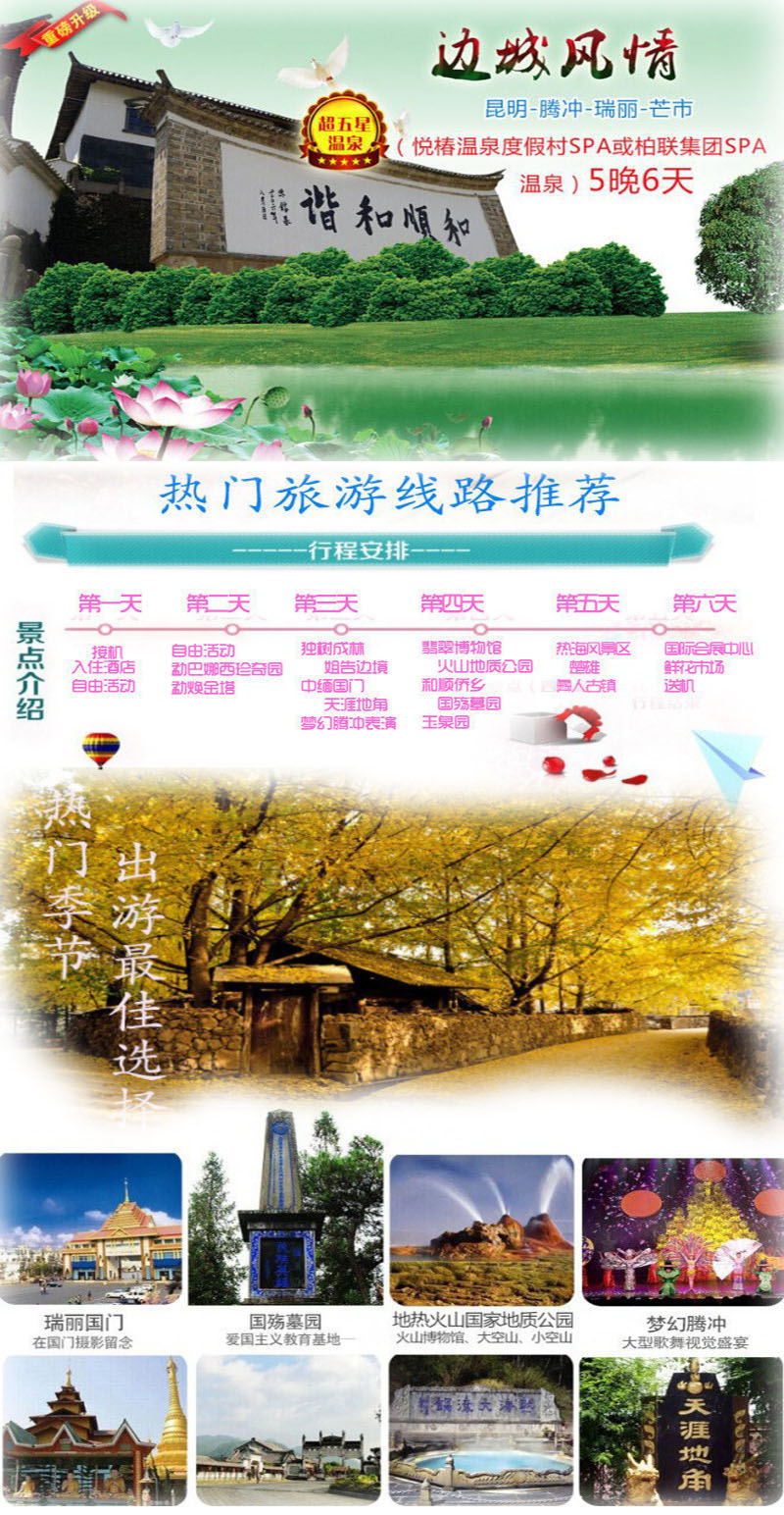 早餐后乘车至瑞丽,游览【独树成林】景区,这株成林独树,株高达28米,树龄在200年以上(游览约30分钟)。后乘车至【姐告边境贸易区】【中缅国门】,【天涯地角】拍影留念。中午前往鹅霸餐厅或自家人餐厅用中餐,在这里您可以品尝到各种德宏民族风味。餐后乘车前往至盈江观【大盈江观景台】(游览20分钟)。途中前往【悦椿温泉度假村】或【柏联温泉】其一,赠送体验温泉泡澡(价值350/人,请自带泳衣)。【悦椿温泉度假村】——坐倚玛御谷,距腾冲镇约15公里。装饰风格精致独特,建筑设计以传统中国诗歌绘画为灵感,古朴的飞檐建筑,也有石板小径在精致的花园中弯转延伸。展示着富有特色的云南文化。温泉村拥有37栋精美汤屋以及汤院,配以现代的设施与装饰风格。您可以在饮用水级别的矿物质温泉汤池里泡汤,尽享感官之旅。是腾冲顶级的温泉度假村。如果您在寻找梦中的温泉度假地,毋庸置疑这儿就是让您美梦成真的地方。【柏联温泉】——柏联集团SPA温泉历来有“亚洲第一”的美誉,由英国设计师设计的腾冲柏联SPA温泉是其第三代作品,既沿袭了柏联SPA温泉一贯遵循的“遁世、隐逸、私密、低奢”的风格,又在融合深厚的地域文化方面凸显异彩。在触摸历史,研习茶道的同时,用SPA调理身心,畅享田园生活。享受完温泉后,乘车前往滇越食府羊之府餐厅用餐,晚餐结束后赠送大型歌舞视觉盛宴《梦幻腾冲》表演,参加梦幻腾冲大剧院欣赏边城绝唱、让您全方位率先了解腾冲独有的多元文化。(表演时间90分钟左右)。表演结束,乘车返回入住酒店