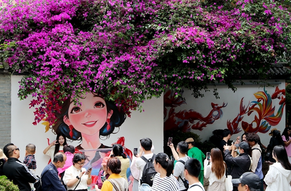 端午假期,昆明中和巷的三角梅“簪花少女”和锦鲤花墙吸引了市民和游客前来打卡。
