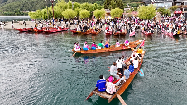 端午假期,丽江泸沽湖景区大落水村的游船停靠点热闹非凡,川滇各村组群众身着盛装齐聚,共同开展摩梭传统猪槽船大赛系列活动。