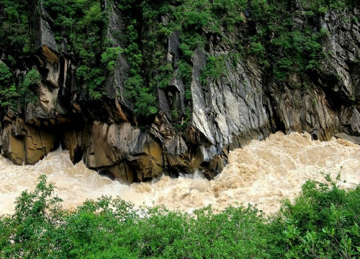 伫立虎跳峡边,震耳欲聋的咆哮,那吞天吐地的气度,完全成了一种雄性威力的宣泄。众多的潜伏江底的虎跳石,阻拦激流涌泻的巨流,喷溅一道一道如翻江倒海般的巨浪,形成白浪冲天的雄奇景观。