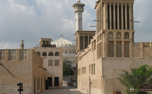 迪拜巴斯塔基亚(Bastakiya)老城,基本保留着传统的阿拉伯风格的建筑和旧貌。古老的巴斯塔基亚区纵横交错的窄巷和矗立着高大烟囱状的风塔的房屋,是昔日迪拜的 见证。在空调尚未发明的时代,居民通过从风塔流入的风来使室内降温。人们还经常在风塔内挂上织物条或小碎布来加强通风。自古以来,阿拉伯的建筑就以海湾两 侧成行的大量风塔而出名。