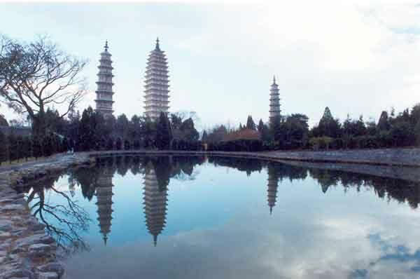 崇圣寺三塔始建于南诏王劝丰祐时期(公元824—859年),先建了大塔“千寻塔”,高69.13米,是座方形密檐式砖塔,共16层。稍后又建了南、北小塔,均高42.19米,是一对八角形的砖塔,都是10级。修建三塔,除了佛家所宣扬的可以成佛外,还有一个重要的原因,是大理古为“泽国多水患”。古籍《金石萃编》中记载:“世传龙性敬塔而畏鹏,大理旧为龙泽,故为此镇之。”相传古时修建三塔,采用垫一层土修一层塔的方法,塔修好以后,才将土逐层挖去,让塔显现出来,故有“堆土建塔”与“挖土现塔”之说。建塔时所搭的桥,高如山丘,长达10余里。修塔时运力不足,还用山羊来驮砖,如今大理的银桥村,古时称为“塔桥村”。古籍记载修三塔,“役工匠七百七十万,耗四万余金,历时八年建成”。修建三塔后,又建了规模弘大的崇圣寺。
