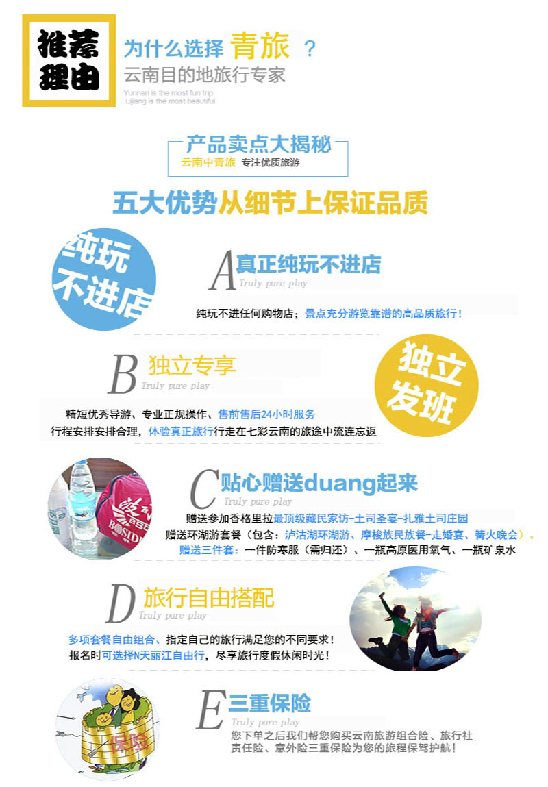 ☆休闲增值服务     报名时可选择增加丽江A线(玉龙雪山、甘海子、白水河、蓝月谷+雪山索道)丽江可增加N天丽江自由行,尽享丽江悠闲度假光!