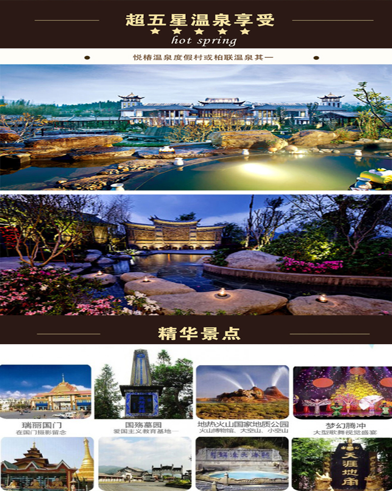 早餐后游览【勐巴娜西珍奇园】(车程约30分钟,景点的游览时间大约为1小时),是国家4A级景区,现已建设成具有古朴、自然、珍奇特点的高品味景点,是全国罕见的生态园林。汇集了少见的大量古树名木和世界罕见的硅化木玉石,其特点是:稀、奇、古、怪,堪称精品荟萃的旅游景点、亚热带植物基因宝库。后游览【勐焕大金塔】(车程约20分钟,景点的游览时间大约为0.5小时),该塔堪称中国第一金佛塔,亚洲第一空心佛塔,属南亚傣王宫的建筑风格,有着深厚的民族文化内涵,是芒市地区一个十分醒目的标志性建筑。中餐赠送品尝具有民族特色的芒市人家傣族风味宴【孔雀宴】(价值680元/桌),感受舌尖上的美食,让你即饱了眼福又饱了口福。餐后乘车前往至盈江观【大盈江观景台】(游览20分钟)。途中前往【悦椿温泉度假村】或【柏联温泉】其一,赠送体验温泉泡澡(价值350/人,请自带泳衣)。【悦椿温泉度假村】——坐倚玛御谷,距腾冲镇约15公里。装饰风格精致独特,建筑设计以传统中国诗歌绘画为灵感,古朴的飞檐建筑,也有石板小径在精致的花园中弯转延伸。展示着富有特色的云南文化。温泉村拥有37栋精美汤屋以及汤院,配以现代的设施与装饰风格。您可以在饮用水级别的矿物质温泉汤池里泡汤,尽享感官之旅。是腾冲顶级的温泉度假村。如果您在寻找梦中的温泉度假地,毋庸置疑这儿就是让您美梦成真的地方。【柏联温泉】——柏联集团SPA温泉历来有“亚洲第一”的美誉,由英国设计师设计的腾冲柏联SPA温泉是其第三代作品,既沿袭了柏联SPA温泉一贯遵循的“遁世、隐逸、私密、低奢”的风格,又在融合深厚的地域文化方面凸显异彩。在触摸历史,研习茶道的同时,用SPA调理身心,畅享田园生活。享受完温泉后,乘车前往滇越食府羊之府餐厅用餐,晚餐结束后赠送大型歌舞视觉盛宴《梦幻腾冲》表演,参加梦幻腾冲大剧院欣赏边城绝唱、让您全方位率先了解腾冲独有的多元文化。(表演时间90分钟左右)。表演结束,乘车返回入住酒店
