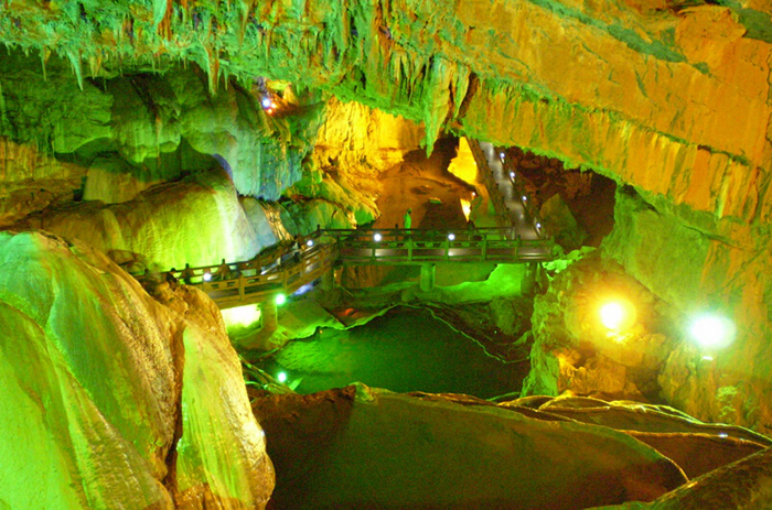 惊魂峡——全国最大的一个洞内峡谷,峡谷最大的落差有上百米。它的形成是由河床不断下切而劈出,当年开辟游路,人攀洞壁而入,稍有不慎,便会掉进深渊,酿成悲剧,工人们要用绳索吊在腰间才能工作,那情境惊险异常,令人魂飞心惧。为了纪念这段开辟的艰险经历,故取名惊魂峡。