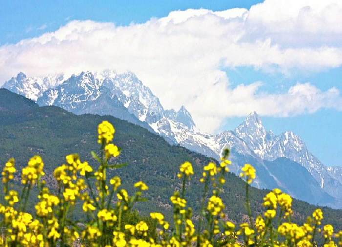 玉龙雪山位于丽江的西北部,距离县城约15公里,它是北半球距离赤道最近的雪山,整座雪山由十三峰组成,由北向南呈纵向排列,延绵近50公里,东西宽约13公里。 玉龙雪山因为山体气候垂直分布,植被和自然景观极其丰富。雪峰下有高山草甸,牦牛在广袤的原始森林旁悠然散步,远处的木楞房里不时传出藏族姑娘的歌声,冰川、峡谷、瀑布,还有在不同高度依次开放的杜鹃花。玉龙雪山主峰常年大部分时间都在云雾缠绕之中,有“神龙见尾不见首”的说法。