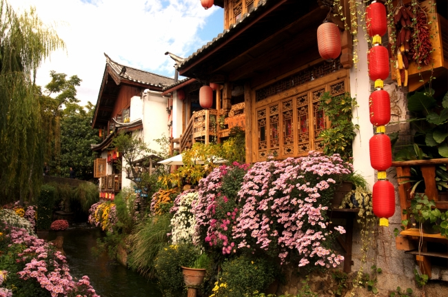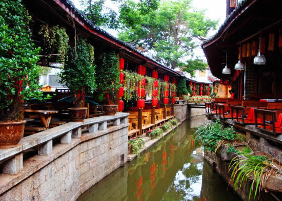 丽江古城即是以四方街发起来的,形成以四方街为中心,四周店铺客栈环绕,沿街逐层外延的稠密而又开放的格局,古老的集市就这样孕育了城市最初的形状,这与中国传统的四四方方的井字形街道是不是一样的。这里四周青山,坝内碧野,泉水萦回,形同碧玉大砚,故命名“大研古城”。
