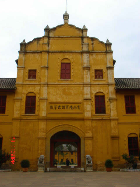 云南陆军讲武堂,从1909年开办,至1928年结束,共招收学生19批,分步、骑、炮、工四科,第15期还有归国华侨和朝鲜、越南的留学生,历届毕业生中,有些后来成为杰出的无产阶级革命将领,如第3期特别班的朱行,第15期的叶剑英等。云南陆军讲武堂旧址,在今省农展馆、省图书馆一带。现存讲武堂的主要建筑,是一院规模宏大的中国传统的走马转角楼式的土、木、石建筑,呈正方形,东、西、南、北楼各约长120米,宽10米,对称衔接,浑然一体,四角有拱形门洞可出人。南北楼为学员宿舍,南楼中部突起,为阅操楼。今农展馆一片,是当时的阅兵集会场地。东楼是办公的地方,西楼是上课的教室。大楼西北面的平房,是当时的礼堂。解放后,这座建筑经多次修缮,保存较为完好。人民政府曾将讲武堂旧址改建为昆明市青少年宫。但由于怕破坏原有建筑的风貌,而又搬离。这使陆军讲武堂保留了原来的模样,留给后人怀旧,并纪念它曾经的辉煌历史。