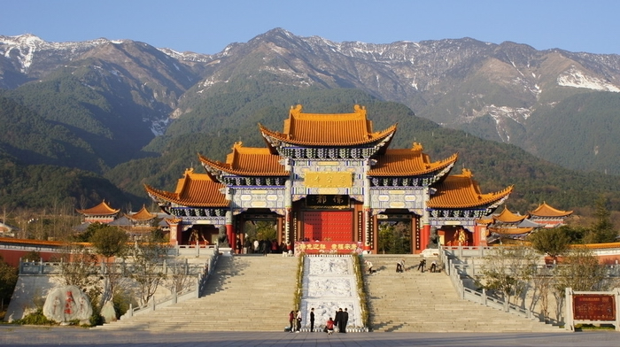 崇圣寺三塔始建于南诏王劝丰祐时期(公元824—859年),先建了大塔“千寻塔”,高69.13米,是座方形密檐式砖塔,共16层。稍后又建了南、北小塔,均高42.19米,是一对八角形的砖塔,都是10级。修建三塔,除了佛家所宣扬的可以成佛外,还有一个重要的原因,是大理古为“泽国多水患”。古籍《金石萃编》中记载:“世传龙性敬塔而畏鹏,大理旧为龙泽,故为此镇之。”相传古时修建三塔,采用垫一层土修一层塔的方法,塔修好以后,才将土逐层挖去,让塔显现出来,故有“堆土建塔”与“挖土现塔”之说。建塔时所搭的桥,高如山丘,长达10余里。修塔时运力不足,还用山羊来驮砖,如今大理的银桥村,古时称为“塔桥村”。古籍记载修三塔,“役工匠七百七十万,耗四万余金,历时八年建成”。修建三塔后,又建了规模弘大的崇圣寺。